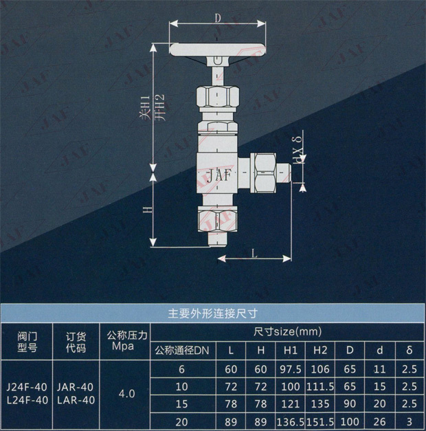 J表示截止閥 L表示節(jié)流閥 A表示結(jié)構(gòu)形式為直角式 G表示管接頭連接 40代表公稱壓力為4.0MPa 40后不標(biāo)注代表代表閥體材質(zhì)為鍛鋼。