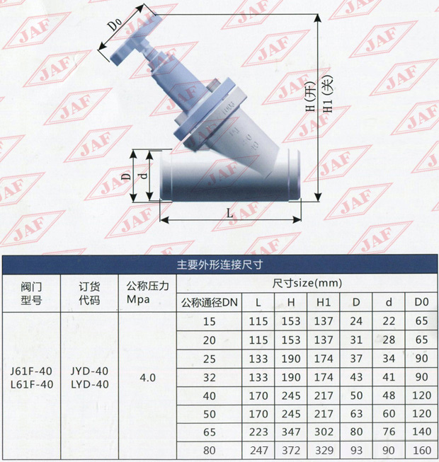 適用范圍 適用于公稱壓力為4.0M Pa、公稱通徑為DN15---DN65閥體材料為鍛鋼的對(duì)焊直流截止閥和節(jié)流閥。 閥門屬性 公稱壓力為4.0MPa,試驗(yàn)壓力為6.0MPa,適用溫度為-50°C-+200°C適用介質(zhì)為氨、氟等。 J表示截止閥 A表示結(jié)構(gòu)形式為直角式 D表示對(duì)焊連接 40代表公稱壓力為4.0MPa 40后不標(biāo)注表示閥體材質(zhì)為鍛鋼。